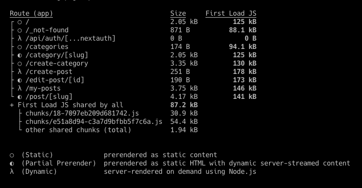 After our application build is successfully done, we can see that the article pages are marked as Partial Prerender